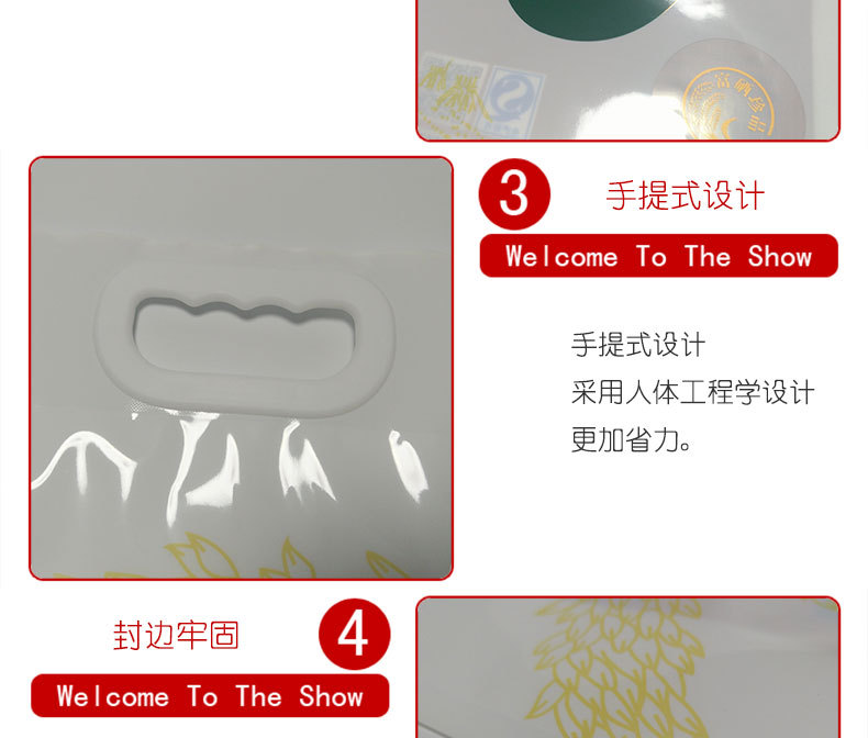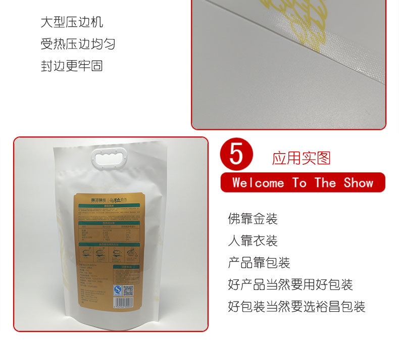 5kg大米包裝袋,復合塑料包裝袋是以合成樹脂或天然樹脂為基礎原料,加入(或不加)各種塑料助劑、增強材料和填料,在一定溫度、壓力下,加工塑制成型或交聯固化成型,得的固體材料或制品。復合軟包裝材料中的“復合”實際上市“層和”的意思,是將不同性質的薄膜或其他柔性材料黏合在一起,再經封合,起到承載、保護及裝飾內物的作用