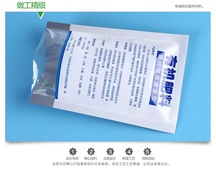 密封性能好、阻隔度高、透氧透濕度超低、防潮防污防輻射防腐化、機械性能強、抗爆破性能高、抗穿刺抗撕裂性能強、耐高溫、耐低溫、外觀高雅、高貴而且實用。本產品可用于裝各種粉粉,干果,茶葉,藥材,藥品,五谷雜糧,化工產品,休閑食品,裝飾品,內衣物,電子元件等等!全部用食品級全新料制作,通過食品質量安全認證,無毒無味,可裝食品。袋子結實牢固,抗拉、抗磨