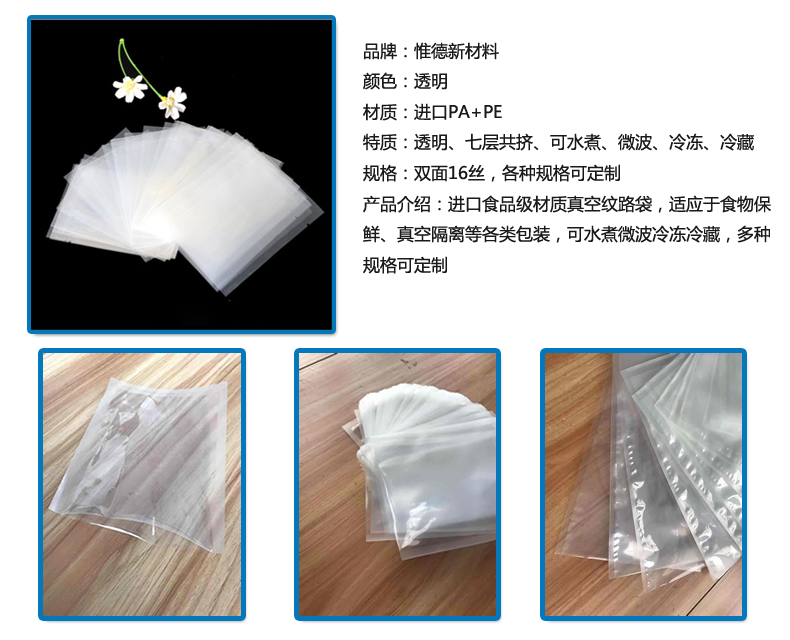 桐城杰美包裝有限公司介紹說,紋路真空包裝袋是采用七層共擠膜加工而成,七層共擠膜是由環(huán)保材料采用物理熱熔方法一次多層共擠而成,無需多層復(fù)合,是一種純綠色包裝材料,適合各種食品的包裝。
